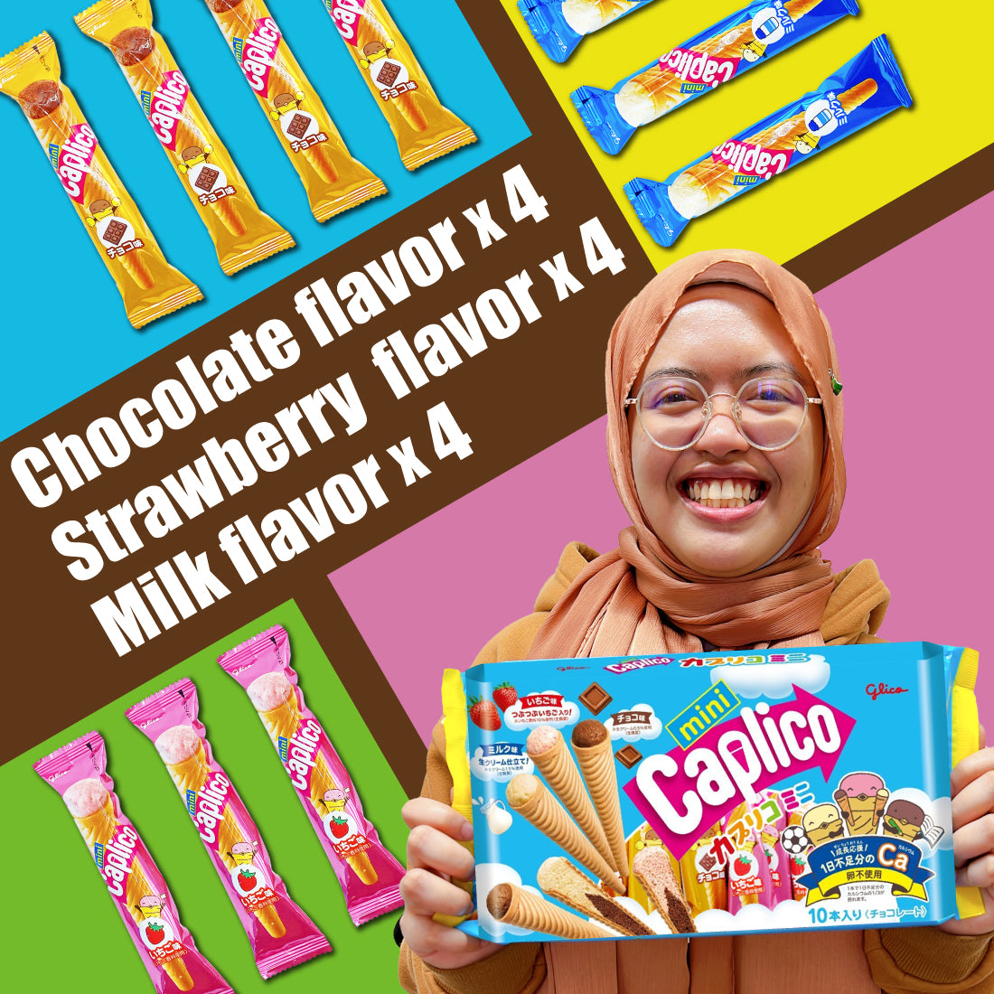 This pack contains 10 easy-to-eat stick-type Wafer Cones. Enjoy sharing the three flavors—chocolate, strawberry, and milk—with family or friends. Egg-free. Contains calcium to help meet your daily needs. (One cone provides one-third of your daily calcium requirement.)