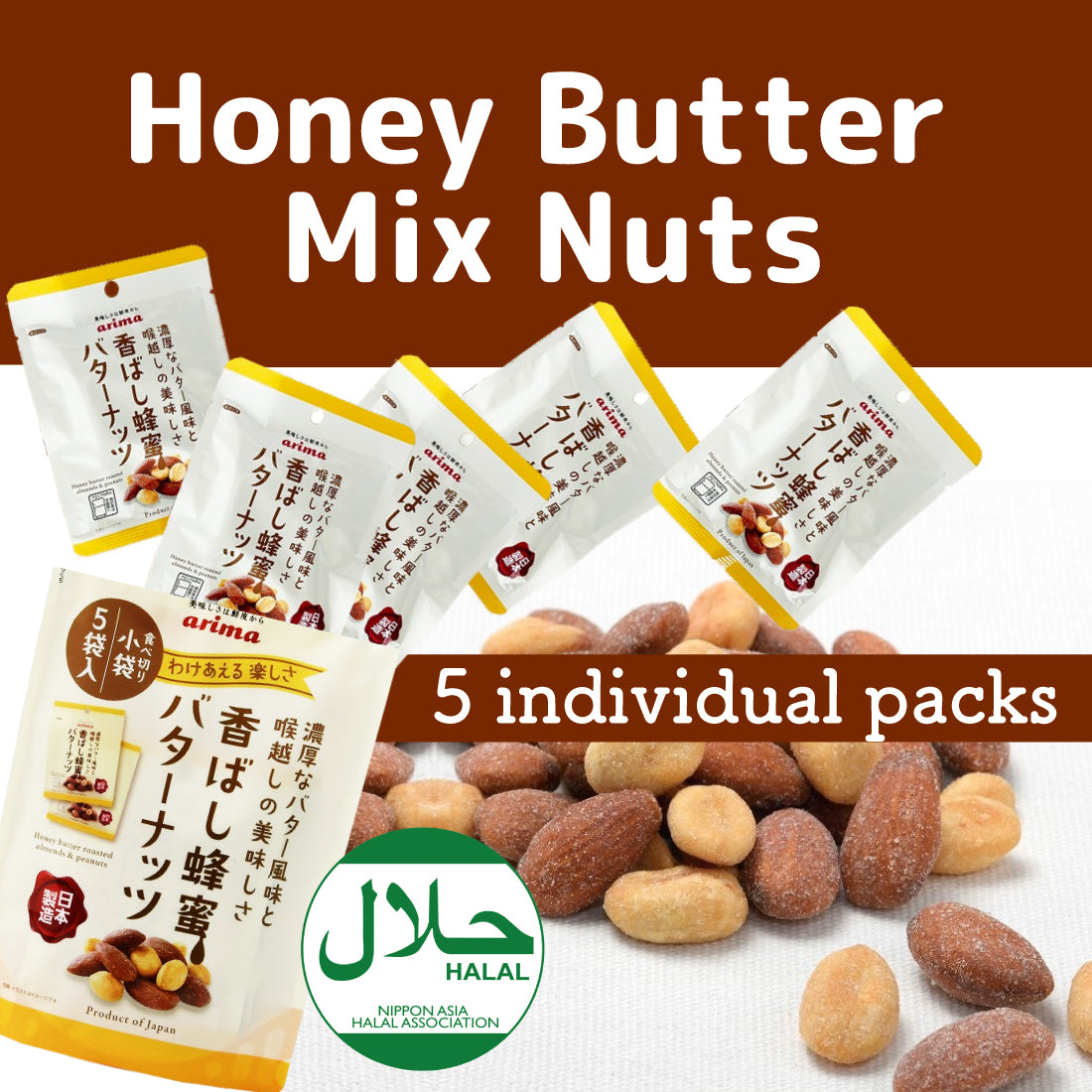 It's packed in 5 individual bags for portion control, ensures maximum freshness, and makes it perfect for sharing. Enjoy the rich, sweet-and-salty flavor of almonds and peanuts, coated in honey and finished with savory butter and a hint of salt.